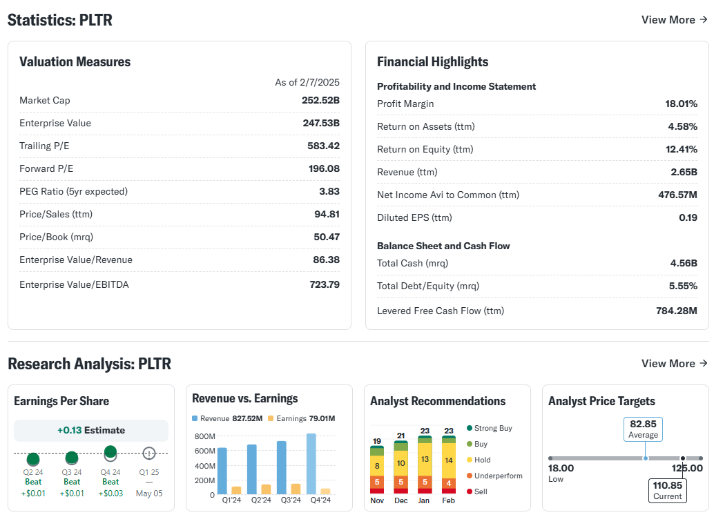 ➡ 팔란티어의 P/E가 585배라는 것은 현재 주가가 실적 대비 상당히 고평가되어 있으며, 미래의 성장성을 선반영하고 있음을 의미한다.