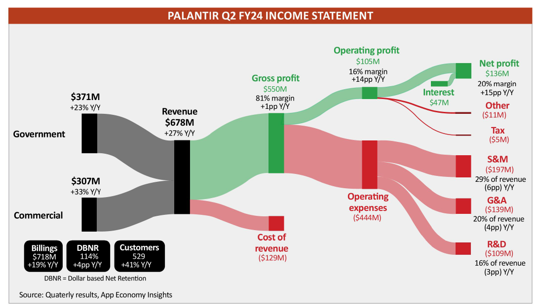 FY24 2분기 동안 팔란티어는 총 6억 7천 8백만 달러의 매출을 기록했습니다. 이는 전년 동기 대비 27% 증가한 수치로, 회사의 지속적인 성장을 나타냅니다. 이 매출은 크게 정부 부문과 상업 부문으로 나뉘며, 각각의 부문에서의 성과가 회사 전체의 성장을 견인했습니다.