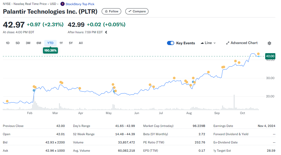 팔란티어(Palantir, NYSE: PLTR)는 기업용 데이터 분석 제품을 제공하는 기술 회사로, 오늘날 AI 중심의 투자 환경에서 주목받는 기업입니다. 엔비디아와 같은 AI 중심 기업들과 비교해 팔란티어는 AI 성장 가속화에 다소 지연된 면이 있었지만, 최근 분기에서 뛰어난 성과를 보이며 두각을 나타냈습니다. 특히 올해 들어 주가는 두 배 이상 상승하여 주당 약 40달러에 도달했으며, 이는 주로 Q1 및 Q2 FY24 실적이 월가의 기대를 초과한 덕분입니다. 이 실적 향상은 미국 상업 부문의 강력한 성장과 인공지능 플랫폼(AIP)의 수요 증가 덕분이었습니다.