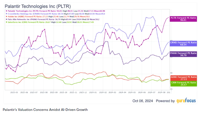 팔란티어에 대한 가장 큰 우려는 고평가된 주가입니다. 현재 팔란티어는 AI 플랫폼(AIP)의 성장 가능성과 뛰어난 재무 성과에도 불구하고, 주식의 평가가 지나치게 높게 책정되어 있습니다. 팔란티어의 **주가수익비율(P/E)**과 미래 P/E 비율은 동종 업계 다른 기업들보다 높은 수준이며, 이는 잠재적인 조정 위험을 동반합니다. 현재 팔란티어는 동종 업계 평균보다 거의 두 배 높은 P/E 비율로 거래되고 있습니다. 예를 들어, 동종 SaaS 기업인 **크라우드스트라이크(CrowdStrike)**는 68.5배의 P/E로 거래되고 있지만, 팔란티어의 주가는 이보다 훨씬 높은 평가를 받고 있습니다. 이는 SaaS 업계 전반적으로 주가 평가 절하가 진행 중임에도 불구하고, 팔란티어만은 여전히 높은 프리미엄을 유지하고 있다는 점에서 우려를 불러일으킵니다.