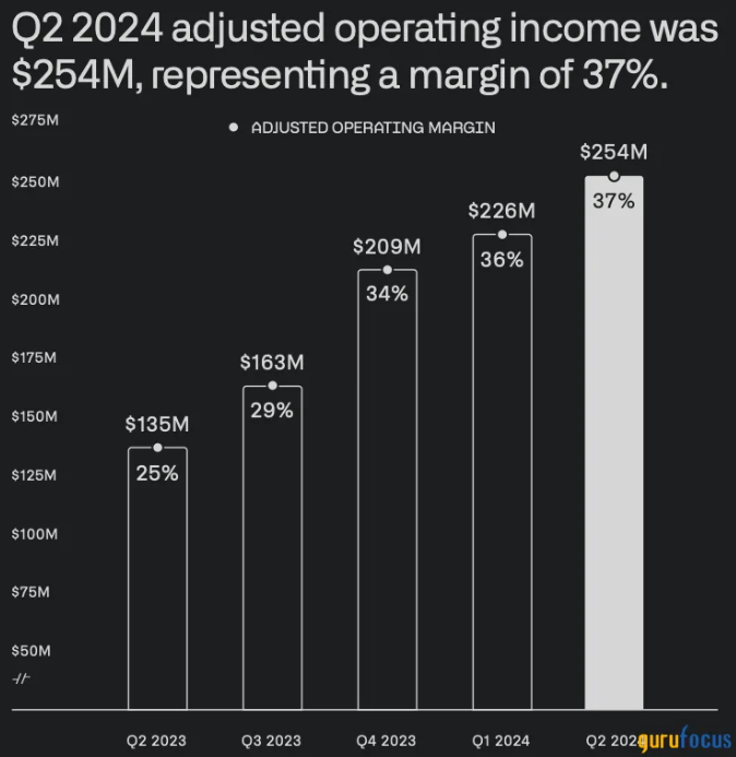 운영 효율성 측면에서도 팔란티어는 큰 성과를 거두고 있습니다. 조정된 영업 이익은 전년 대비 88% 증가하여 2억 5,400만 달러를 기록했으며, 이는 회사가 제시한 가이던스 범위인 2억 900만~2억 1,300만 달러를 초과한 수치입니다. 특히 영업 마진은 **37%**로 전년 대비 1,200bps(기초 포인트) 상승하며, 팔란티어가 운영 효율성을 지속적으로 향상시키고 있음을 보여줍니다.