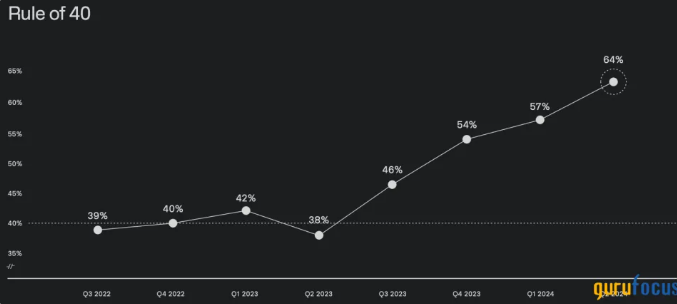 또한, 팔란티어의 Rule of 40 점수는 Q1의 57에서 Q2에는 64로 개선되었으며, 이는 SaaS(서비스형 소프트웨어) 기업에서 매출 성장과 수익성 간의 균형을 측정하는 중요한 지표입니다. 이 점수의 향상은 팔란티어가 성장성과 수익성 모두에서 우수한 성과를 보여주고 있음을 반영합니다.