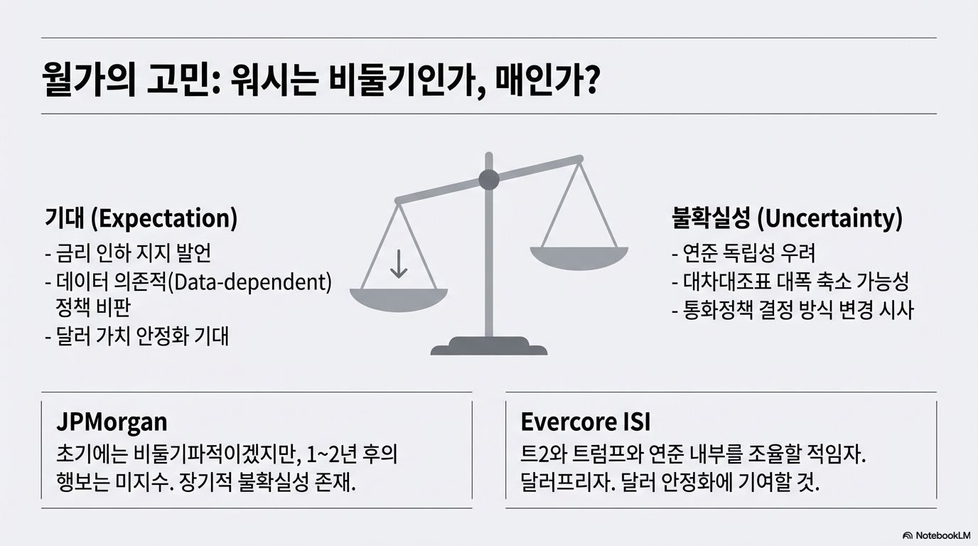 하지만 그의 등장을 바라보는 월가의 시선은 엇갈립니다. 워시는 최근 금리 인하를 지지하는 발언을 이어왔으며, 현재 연준이 지나치게 지표에 의존하는 방식을 바꿔야 한다는 개혁적인 목소리를 내왔습니다. 이 때문에 그의 지명은 연준의 기존 통화 정책 기조에 큰 변화를 예고하는 신호로 받아들여졌습니다. JP모건은 "진짜 케빈의 모습이 무엇인지는 아직까지 큰 의문이 될 것"이라며 그의 정책 방향성에 대한 우려를 표했습니다. 반면, 에버코어 ISI는 "FMC를 설득하는 내부 인물로서는 아주 좋은 사람"이라며 트럼프와 연준 사이에서 균형을 잡아줄 것이라는 긍정적인 평가를 내놓았습니다.