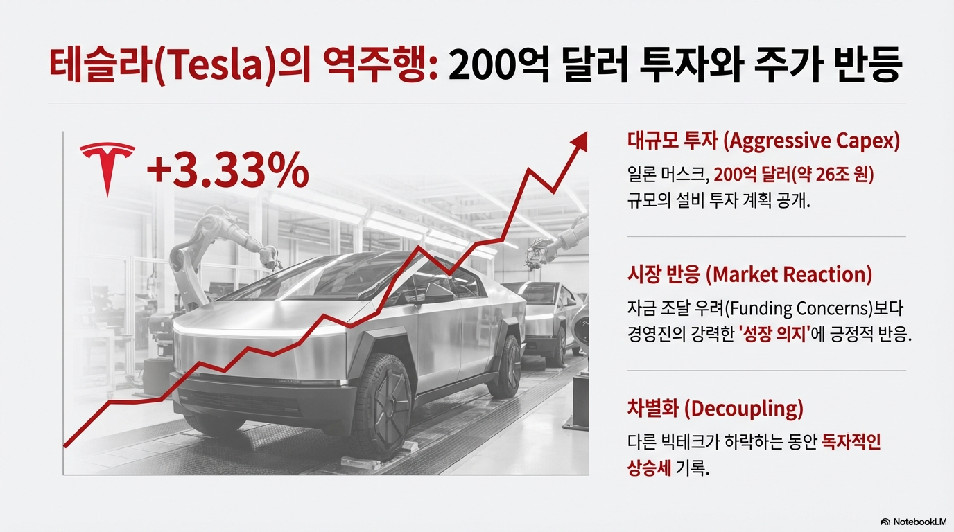 • 테슬라 (Tesla): 일론 머스크가 200억 달러 규모의 대규모 투자 계획을 발표한 이후 자금 조달에 대한 우려가 제기됐지만, 주가는 오히려 3.33% 상승하는 반전을 보여주었습니다. 이는 시장의 우려를 뛰어넘는 성장 동력에 대한 믿음이 반영된 결과로 해석됩니다.