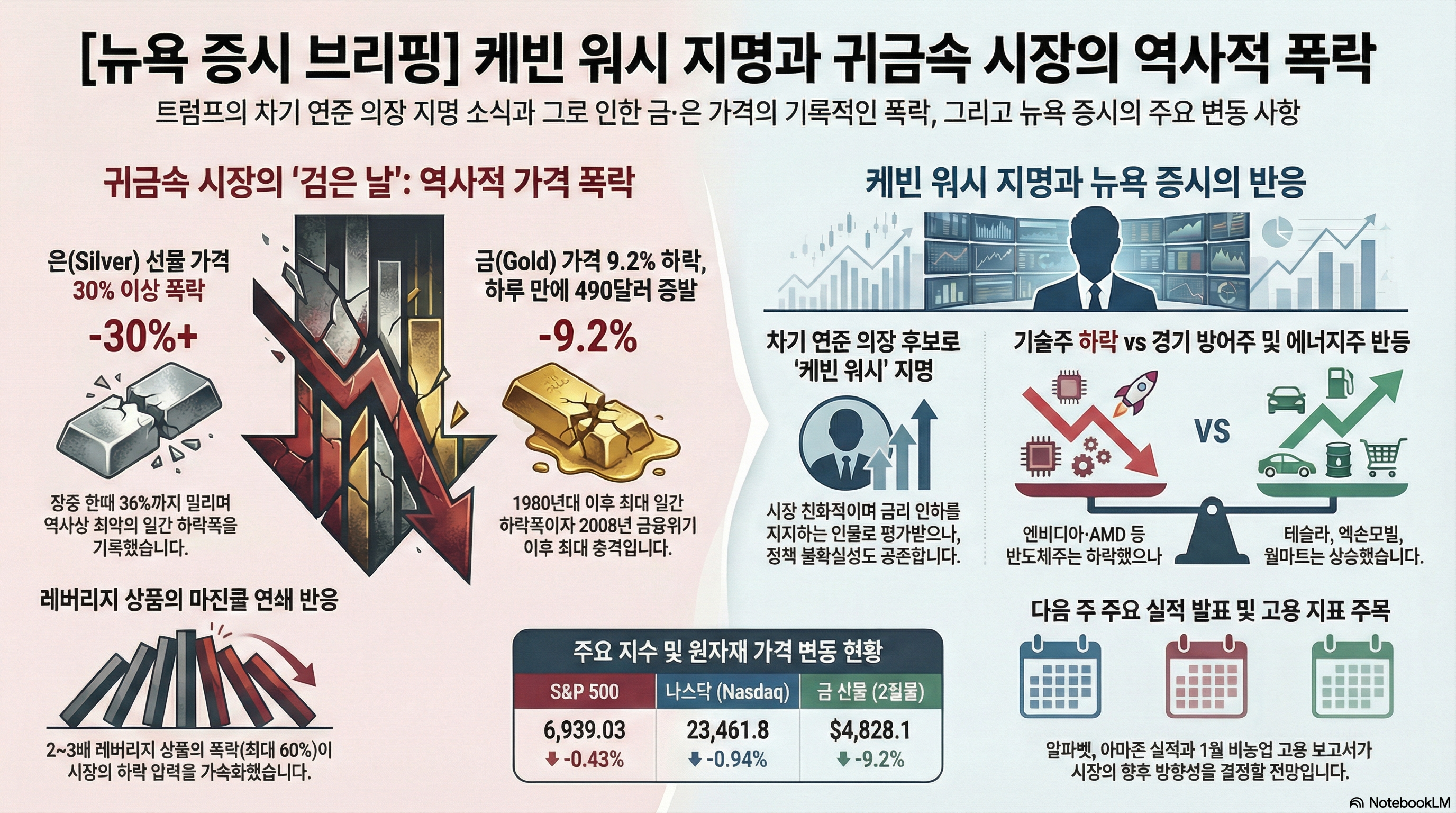 귀금속 시장의 역사적인 폭락, 연준 의장 지명을 둘러싼 기대와 우려, 전체 시장을 역행한 개별 주식의 움직임, 그리고 좋은 실적마저 외면하는 '기대치의 함정'까지. 오늘 하루 뉴욕 증시는 하나의 방향으로는 설명할 수 없는 복잡하고 예측 불가능한 모습을 보여주었습니다.