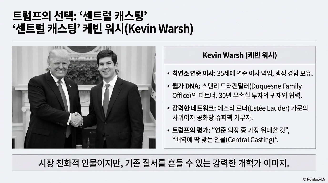 귀금속 시장을 뒤흔든 근본적인 원인은 도널드 트럼프의 차기 연준 의장 지명이었습니다. 그가 선택한 인물은 바로 케빈 워시(Kevin Warsh)입니다. 그는 과거 45세의 나이로 최연소 연준 이사로 지명되었으나 2011년에 연준을 떠난 인물이며, '30년간 손실을 본 적 없는' 전설적인 투자자 스탠리 드러켄밀러의 파트너이자 에스티로더 가문의 사위라는 독특한 이력을 가졌습니다.