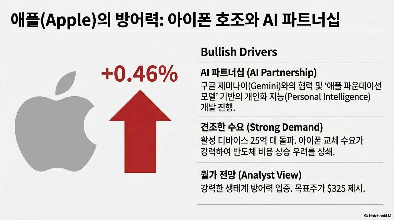 • 애플 (Apple): 반도체, 특히 메모리 가격 상승으로 인해 아이폰의 마진이 축소될 수 있다는 우려에도 불구하고 주가는 0.46% 상승했습니다. 그 배경에는 25억대에 달하는 활성 디바이스를 기반으로 한 강력한 AI 전략과 구글과의 파트너십에 대한 기대감이 있었습니다. 시장은 단기적인 원자재 우려보다 애플이 가진 거대한 생태계와 미래 비전에 더 높은 점수를 준 것입니다.
