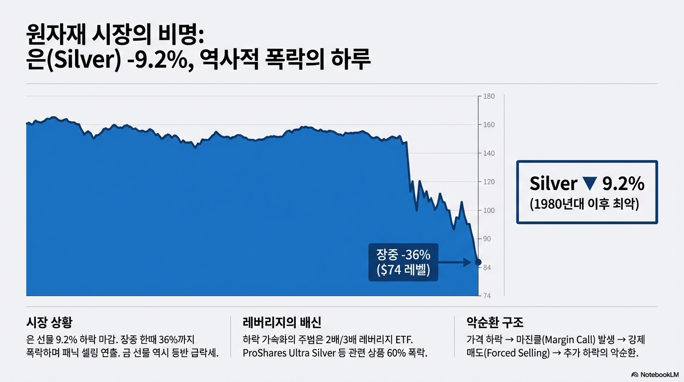시장에서 가장 큰 충격을 안겨준 사건은 귀금속 시장에서 터져 나왔습니다. 은 선물 가격이 장중 한때 무려 36%까지 폭락하며 말 그대로 '역사상 최악의 하루'를 기록했습니다. 안전자산의 대명사인 금 선물 역시 1980년대 이후 최대 일간 하락폭을 보였는데, 이는 2008년 금융위기 이후 처음 있는 대규모 하락이었습니다.