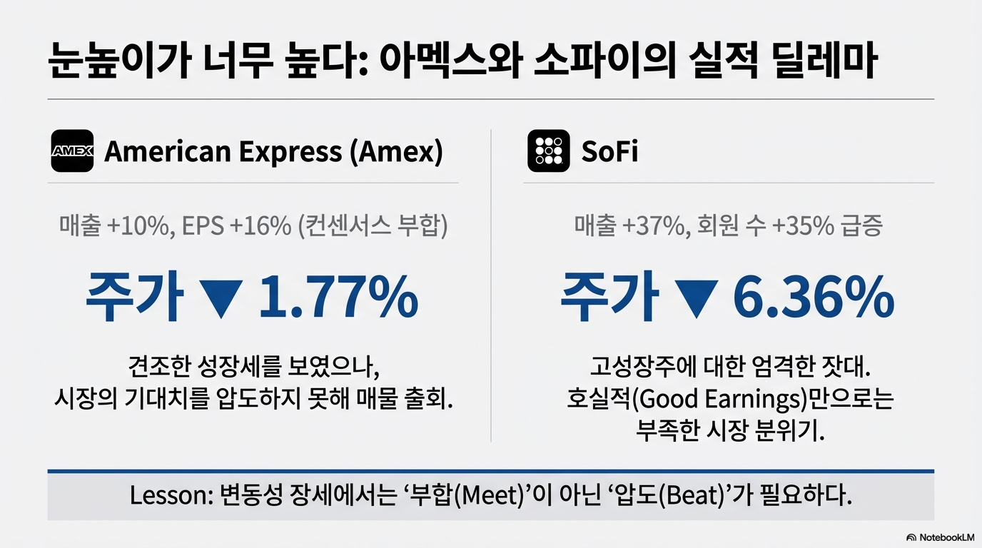 아메리칸 익스프레스는 매출이 10% 성장했고, 소파이(SoFi)는 매출이 37%, 회원이 35%나 증가하는 훌륭한 실적을 거두었습니다. 하지만 두 기업의 주가는 각각 1.77%, 6.36% 하락했습니다. 이유는 단 하나, 그 실적이 '시장에서 예상하던 수준에 부합하는' 정도였기 때문입니다.