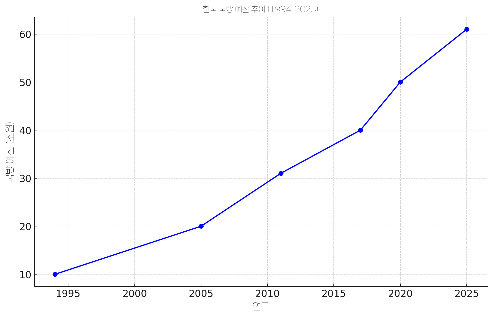 한국의 국방비는 1994년 처음으로 10조 원을 돌파한 이후 꾸준히 증가해왔습니다. 주요 변곡점을 보면 2005년에 20조 원, 2011년에 31조 원, 2017년에 40조 원, 2020년에 50조 원, 그리고 2025년에 약 61조 원을 기록하며 사상 최대 규모에 도달했습니다. 이러한 예산 증가는 북한의 핵무기 개발과 미사일 시험발사 등 안보 위협에 대응하고자 하는 노력의 일환입니다.