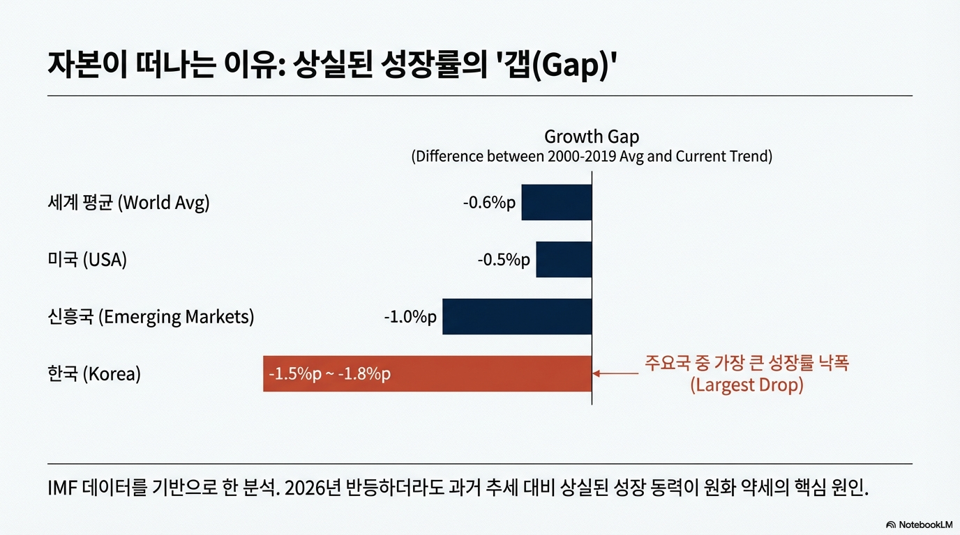 이는 한국 경제의 성장 잠재력이 다른 어떤 주요국보다도 가장 가파르게 추락하고 있다는 의미입니다. 글로벌 투자자들은 바로 이 '낙폭'을 보고 있으며, 이것이 한국 시장에 대한 투자를 주저하게 만드는 핵심 요인입니다.