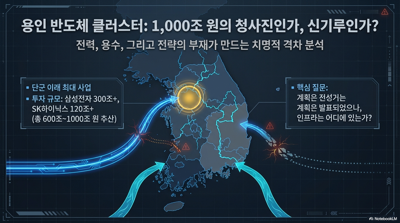 '단군 이래 최대 사업', '1000조 원 이상 투자'. 용인 반도체 클러스터는 그 수식어만으로도 압도적입니다. 누가 뭐래도 "우리나라 산업의 제일은 반도체"이며, 이 프로젝트는 한국 산업의 미래가 걸린 중차대한 계획임이 분명합니다. 하지만 이 화려한 청사진 이면에는, 우리가 애써 외면해 온 치명적인 문제점들이 똬리를 틀고 있습니다. 이 글에서는 용인 반도체 클러스터가 마주한 가장 시급한 3가지 난제, 즉 전력, 용수, 그리고 이 근본적인 문제들이 만들어 낸 ‘정치적 소음’의 실체를 깊이 파헤쳐 보고자 합니다.