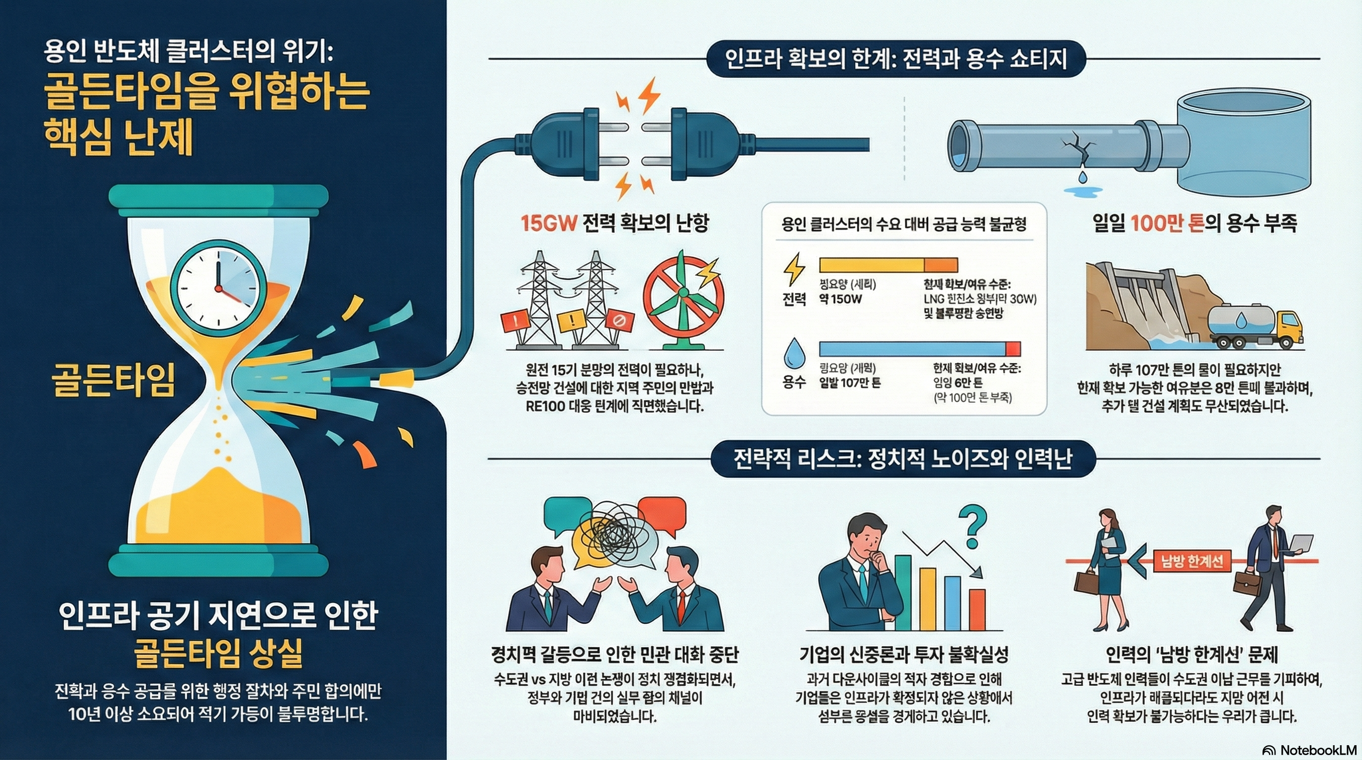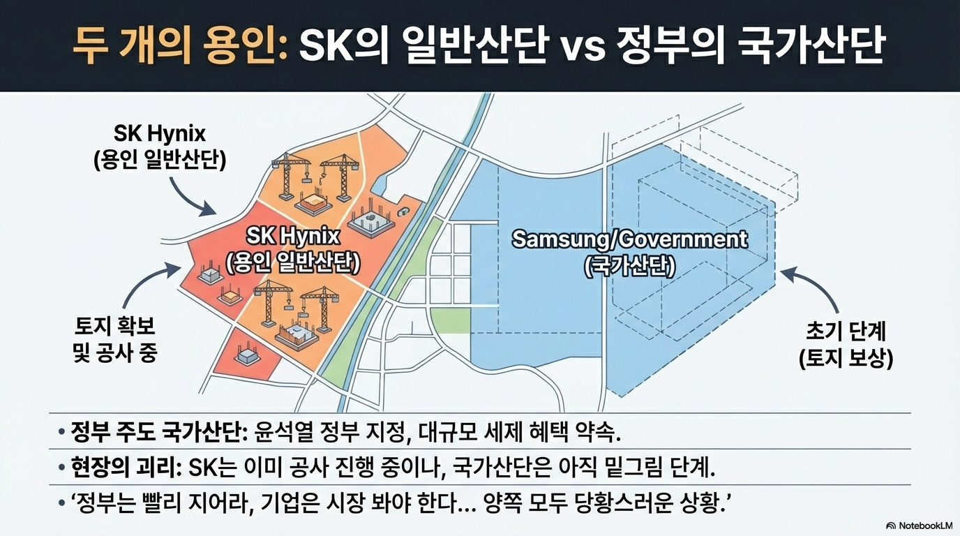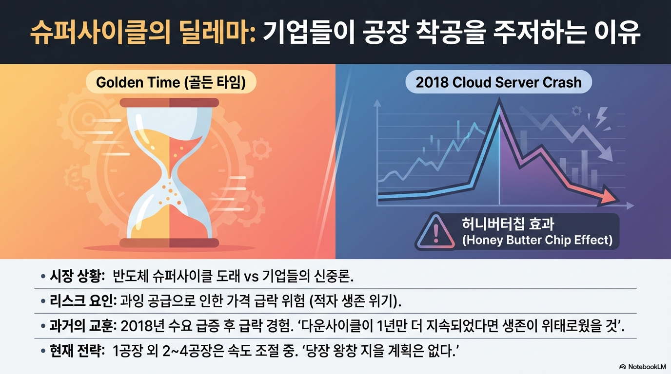 마지막 문제점은 이 모든 인프라 공백이 초래한 필연적 결과, 바로 ‘정치적 소음’입니다. 삼성전자나 SK하이닉스 같은 기업들은 반도체 시장의 주기를 고려해 신중하게 투자를 집행하길 원합니다. 2018년의 급격한 다운 사이클 당시 "1년만 더 갔다면 하이닉스가 망했을 거다"라는 말이 나올 정도로 시장 변동성은 기업의 생존을 위협합니다. 따라서 기업들은 부지는 확보했지만, 시장 상황을 보며 투자 속도를 조절하겠다는 신중한 입장입니다.