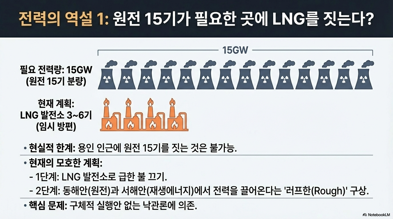 용인 클러스터가 계획대로 완성될 경우 필요한 전력량은 약 15기가와트(15GW). 이는 1GW급 원자력 발전소 15기가 동시에 생산하는 전력과 맞먹는, 그야말로 국가적 규모의 에너지 수요입니다. "원전이 15개가 필요한 거예요." 문제는 이 막대한 전력을 어떻게 공급할지에 대한 계획이 놀라울 정도로 부실하다는 점입니다.