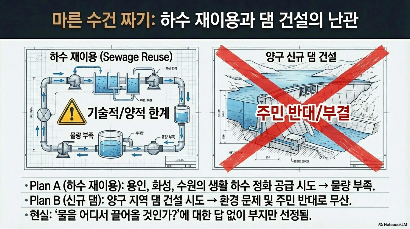 이 엄청난 부족분을 메우기 위한 대책 역시 뚜렷하지 않습니다. 팔당댐 상류 유역에 새로운 소규모 댐을 건설하자는 아이디어가 있었지만, 이마저도 "양구 주민들의 반대 등등 이래서" 사실상 중단된 상태입니다. 전력과 마찬가지로 용수 문제 역시 구체적인 해결책 없이 프로젝트의 발목을 잡고 있는 핵심 난제입니다.