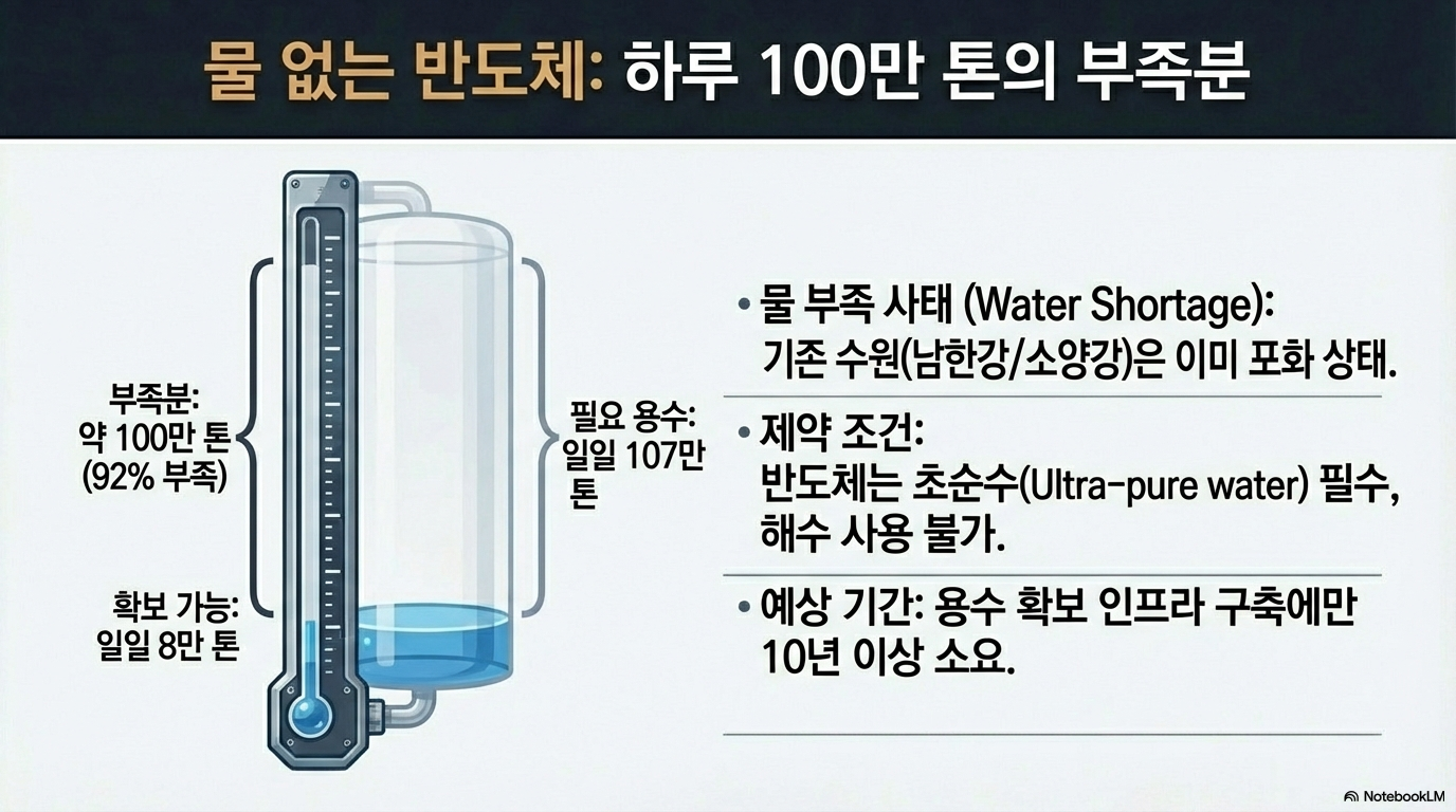 전력 문제만큼이나 심각한 것이 바로 물 부족입니다. 반도체 공정에는 대량의 초순수가 필수적인데, 클러스터의 하루 용수 필요량은 무려 107만 톤("필요한 용수가 107만 톤이에요")에 달합니다. 하지만 현재 용인 지역에서 추가로 공급할 수 있는 물의 양은 고작 8만 톤에 불과합니다. "현재 기준으로 하면은 8만 톤 수준에 불과하다"는 이 현실은, 매일 약 100만 톤의 물이 부족하다는 계산으로 이어집니다.