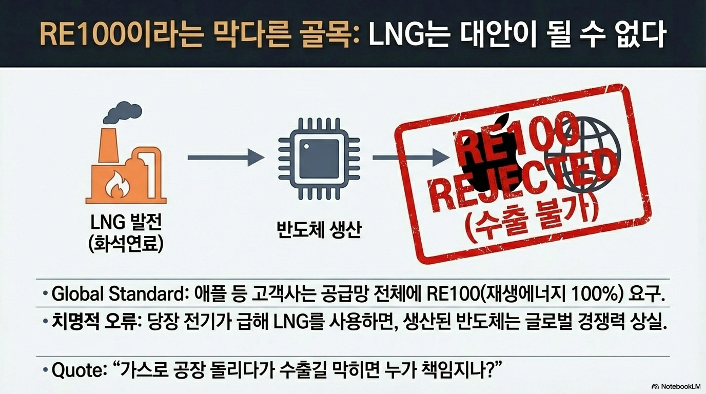 정부의 계획은 두 단계로 나뉩니다. 우선 시급한 전력을 충당하기 위해 신규 LNG 발전소 몇 개를 짓는 것이 단기 대책입니다. 하지만 이는 시작부터 ‘RE100(재생에너지 100% 사용)’이라는 글로벌 표준과 정면으로 충돌합니다. 애플처럼 공급망 전체에 RE100을 요구하는 고객사들에게 LNG로 만든 반도체는 심각한 약점이 될 수 있습니다.
