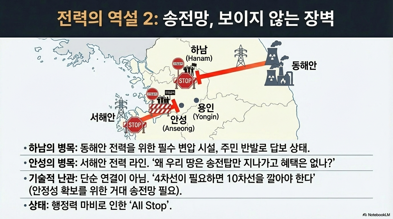장기 대책은 더욱 막막합니다. 멀리 떨어진 전라도에서 재생에너지를, 경상도에서 원전 전력을 끌어온다는 구상인데, 이는 거대한 송전망 건설을 전제로 합니다. 하지만 이 계획은 이미 극심한 주민 반대라는 암초에 부딪혔습니다. 안성 주민들은 "우리가 호구냐"며 강하게 반발하고 있고, 하남의 변압 시설 부지 문제는 단순한 지역 이기주의를 넘어섰습니다. 주민들은 "원래 송전망은 경기 북부로 가기로 했는데 왜 갑자기 남부로 바뀌었나"라며 행정 절차상의 문제를 제기하고 있어, 단순한 보상으로 해결될 사안이 아닙니다. 이처럼 단기 대책은 글로벌 경쟁력에, 장기 대책은 사회적 합의에 발목이 잡힌 형국입니다.