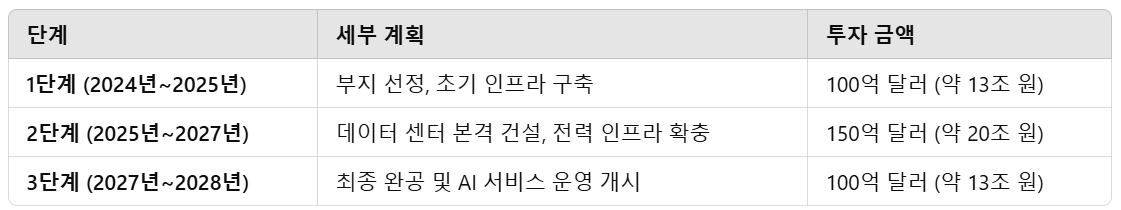 • 1차적으로 100억 달러(약 13조 원) 투자하여 기본 인프라를 구축하고, 이후 최대 350억 달러까지 투자 확대할 계획.