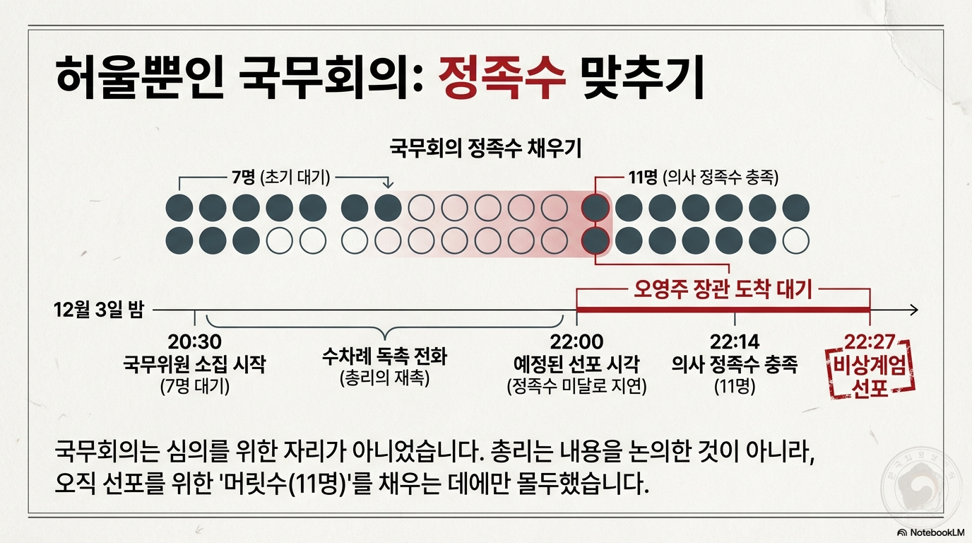 ◦ 당시 21명의 국무위원 중 11명만이 참석하여 의사정족수(11명)를 겨우 채운 상황에서, 피고인은 계엄의 필요성과 정당성을 역설하며 안건 통과를 주도했다.