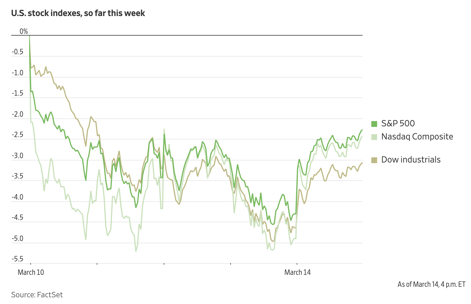 그럼에도 불구하고 시장 하락세는 계속됐으며, 목요일까지 S&P 500 지수는 2월 19일 사상 최고치 대비 10% 하락했다. 단 16거래일 만에 조정장(correction)으로 진입한 것은 최근 5년 내 가장 빠른 속도이며, 지난 50년 동안 11번째로 빠른 조정이었다.