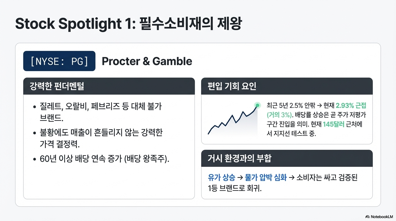 1. P&G (PG) 60년 넘게 배당을 늘려온 대표적인 '배당 왕족주'입니다. 불황에도 소비를 멈출 수 없는 필수소비재의 강력한 브랜드 파워를 보유하고 있습니다. 현재 배당률은 역사적 평균인 2.5%를 상회하여 3% 수준에 육박하고 있으며, 주가가 하락 채널에서 지지를 테스트하고 있어 가격 매력이 충분한 구간입니다.
