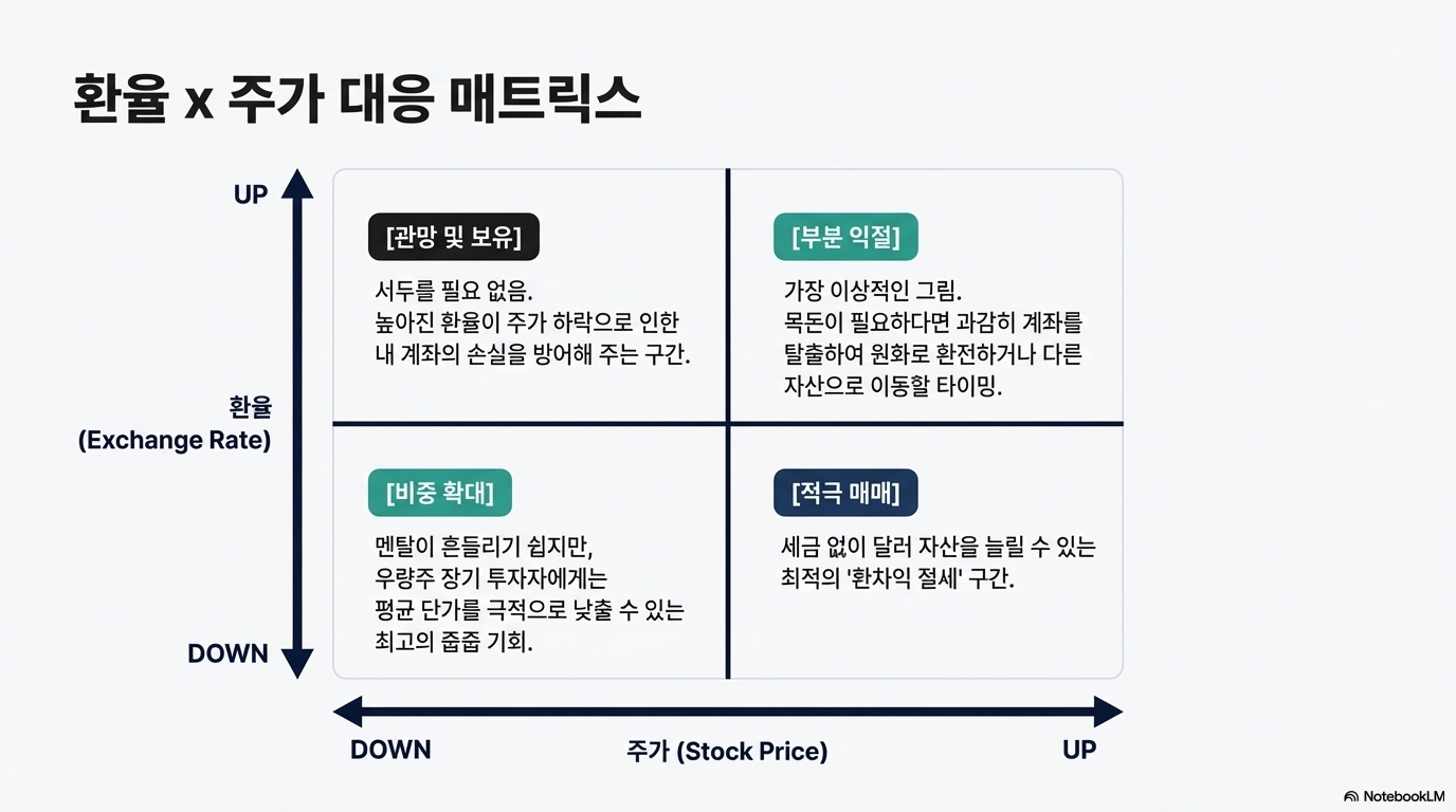 투자 상식으로는 '저환율 매수, 고환율 매도'가 정답처럼 들리지만, 절세와 달러 자산 증식이라는 관점에서 보면 '고환율 매수, 저환율 매도'라는 역발상 전략이 매우 강력한 힘을 발휘합니다.