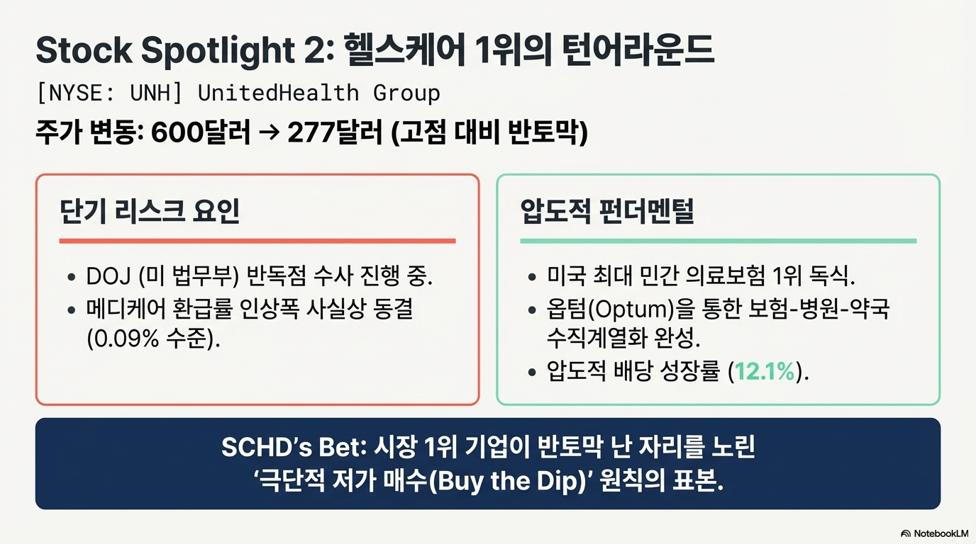 2. 유나이티드 헬스 (UNH) 미국 최대 민간 의료보험 기업으로 시장 점유율 1위의 압도적 지위를 갖고 있습니다. 최근 정책 리스크와 수사 이슈로 인해 600달러를 상회하던 주가가 277달러 수준까지 급락했습니다. 시장은 공포에 질려 있지만, SCHD는 이를 업계 1위 우량주를 저점에 매수할 기회로 보았습니다.
