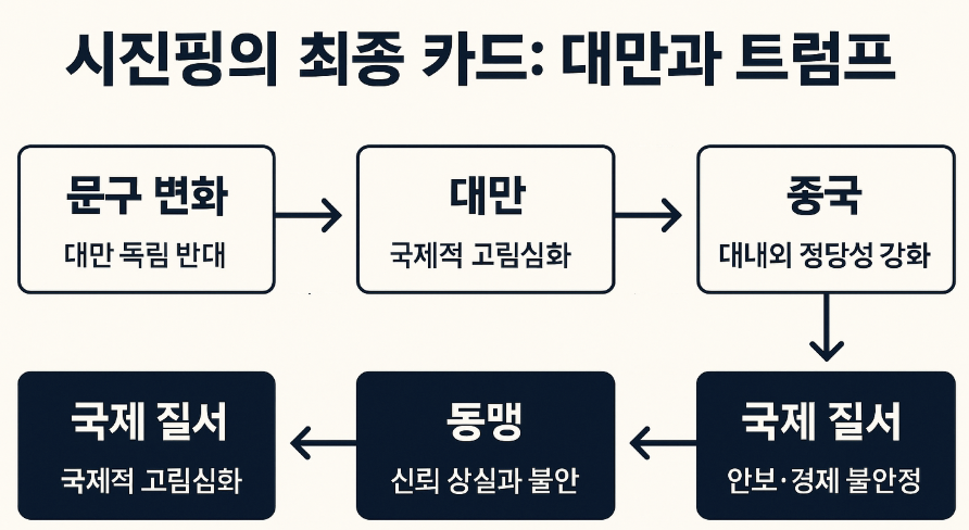시진핑은 대만 문제를 자신의 정치적 유산으로 만들고자 하며, 그 과정에서 미국의 정책 문구 변화를 가장 효율적인 전략으로 삼고 있습니다. 트럼프는 경제적 성과를 위해 이 카드를 받아들일 유인이 있지만, 이는 곧 동맹국의 신뢰 상실과 대만해협 불안정 심화로 이어질 수 있습니다.