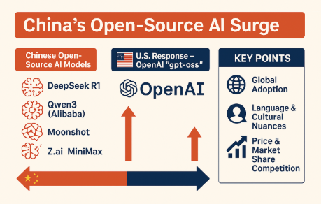 결과적으로, 중국의 오픈소스 AI 부상은 기술 경쟁력·시장 확장성·전략적 국가 지원이라는 세 축이 맞물리며, 단기간에 글로벌 AI 표준 경쟁의 최전선에 올라서게 된 것입니다.
