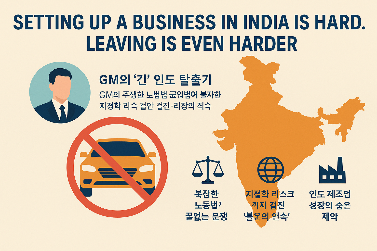 GM의 인도 철수 사례는 이러한 모순을 집약적으로 보여줍니다. GM은 20여 년간 10억 달러 이상의 손실을 감수하며 인도 시장에 도전했지만, 결국 시장을 떠나기로 결정했습니다. 하지만 문제는 ‘떠나기로 한 순간부터’ 시작이었습니다. 노조와의 소송, 노동법 규제, 주 정부와의 정치적 줄다리기, 심지어 지정학적 갈등까지 겹치면서 철수는 무려 6년에 걸친 소송·교섭·협상·매각의 장기전으로 이어졌습니다. 이 과정은 단순한 기업 실패가 아니라, 인도가 제조업 허브로 도약하는 데 있어 풀어야 할 구조적 과제를 여실히 드러냈습니다.