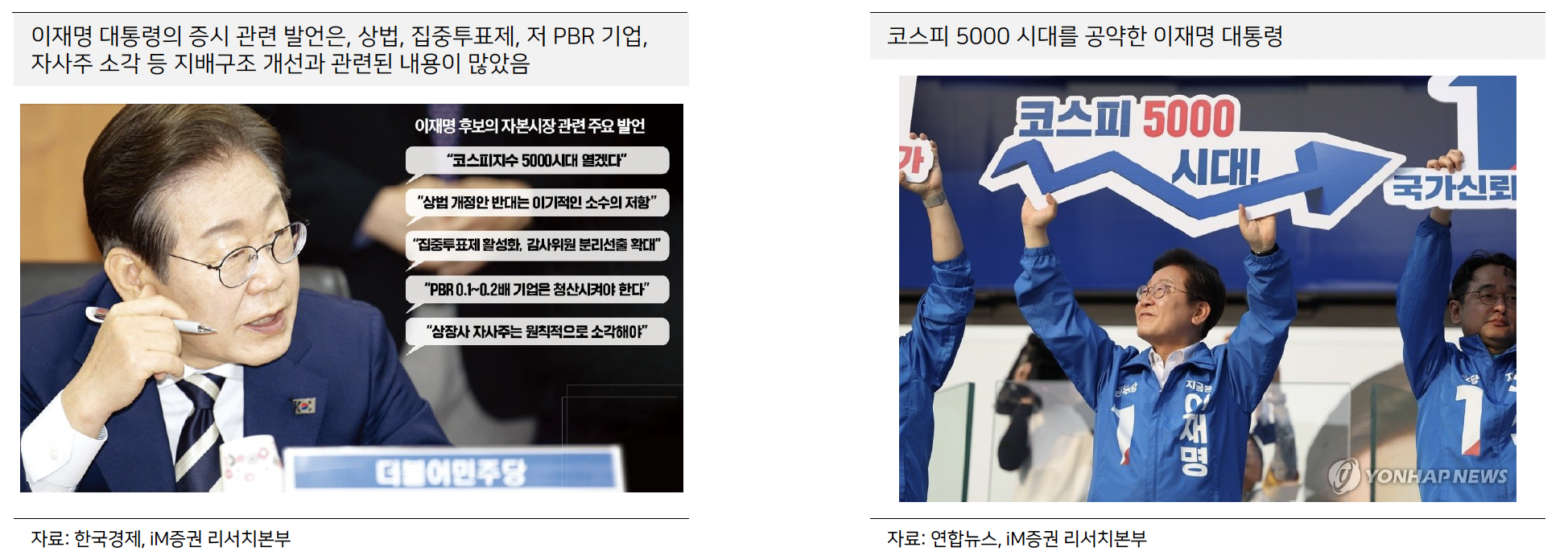 - KOSPI 5,000을 공언하며 상법 개정·지배구조 개선에 의지를 보임