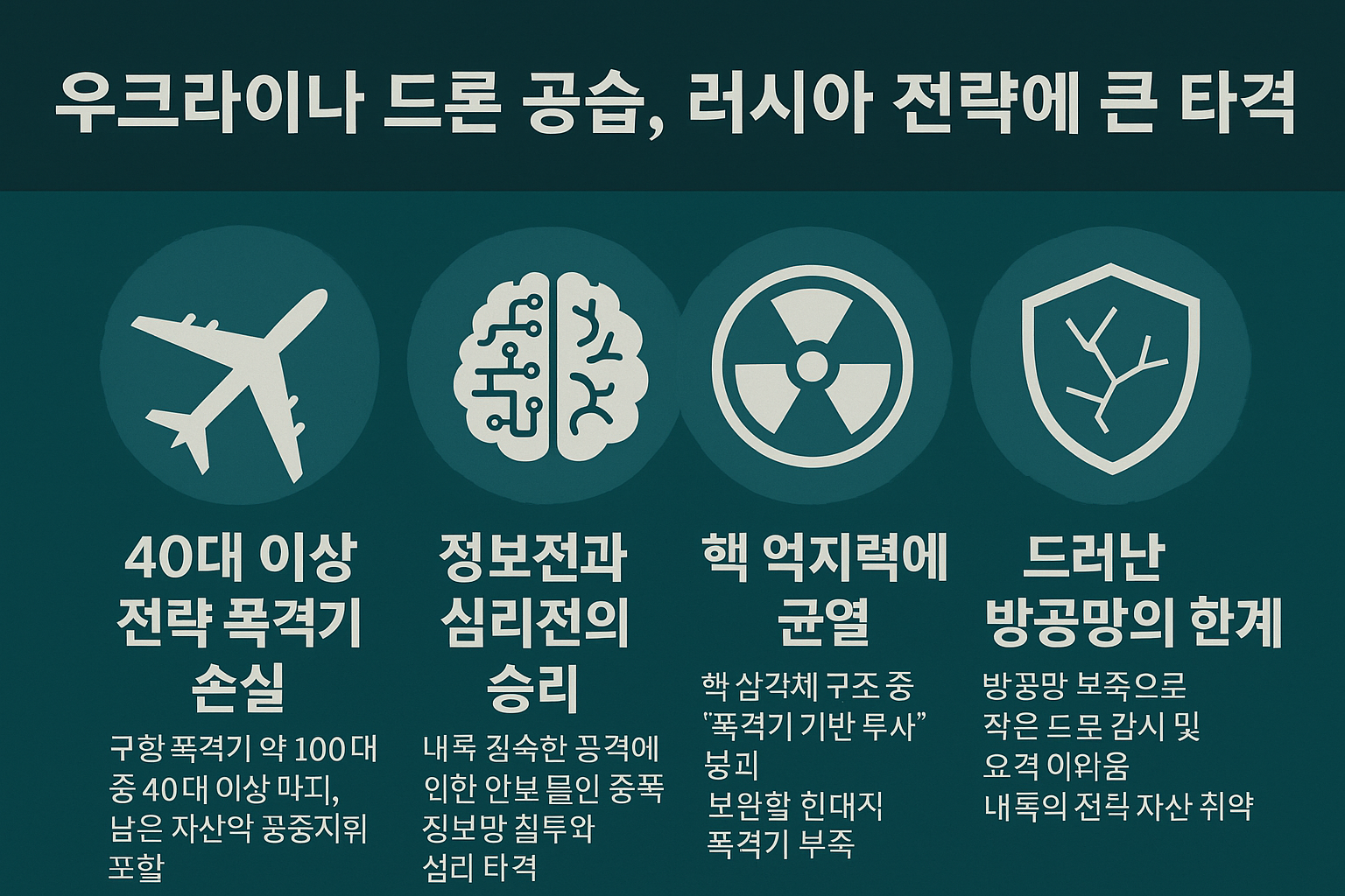 우크라이나의 이번 드론 공습은 물리적인 피해 그 이상을 남겼습니다. 파괴된 것은 단순한 전투기가 아니라, **러시아가 자신감을 가져온 '전략적 우위'와 '내부 보안의 신화'**였습니다.