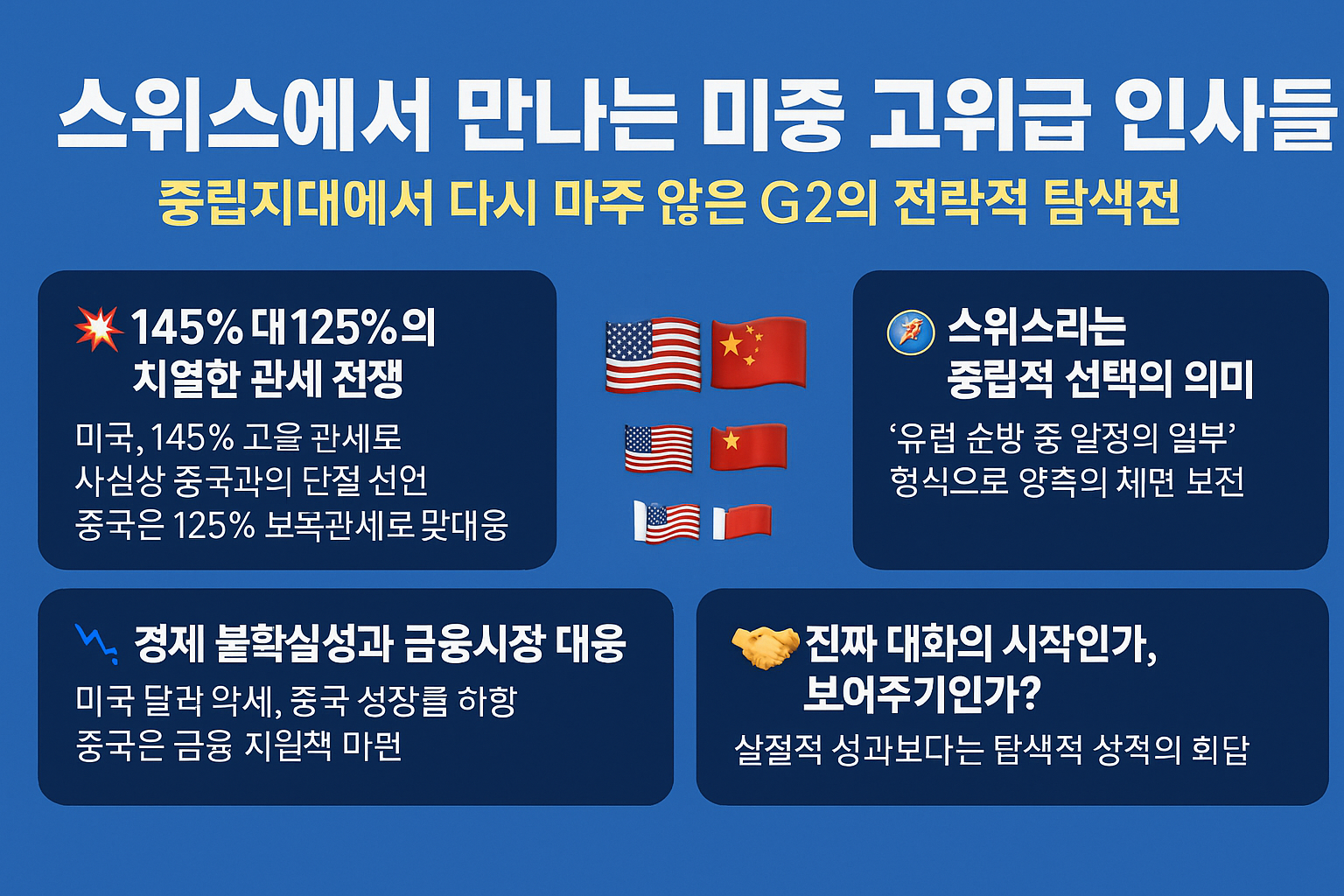 2025년 5월, 미중 양국이 마침내 다시 마주 앉기로 했습니다. 장소는 스위스, 그리고 명목은 '유럽 순방 중 일정의 일부'. 겉으로 보기엔 단순한 외교 행보 같지만, 그 안에는 심각하게 얼어붙은 양국 간 무역 갈등에 숨통을 틔우려는 미묘한 의도가 숨어 있습니다.
