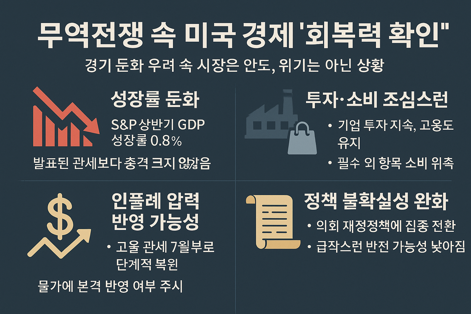 미국 경제는 2025년 들어 확실한 둔화 국면에 접어들었습니다. S&P 글로벌 마켓 인텔리전스는 올해 1분기와 2분기를 포함한 **상반기 GDP 성장률을 연율 기준 0.8%**로 추정하고 있으며, 이는 2024년 전체 성장률 2.5%에 비해 현저한 하락입니다. 수치만 보면 경기 침체 전조처럼 보일 수 있지만, 시장의 해석은 다소 온도차가 있습니다.
