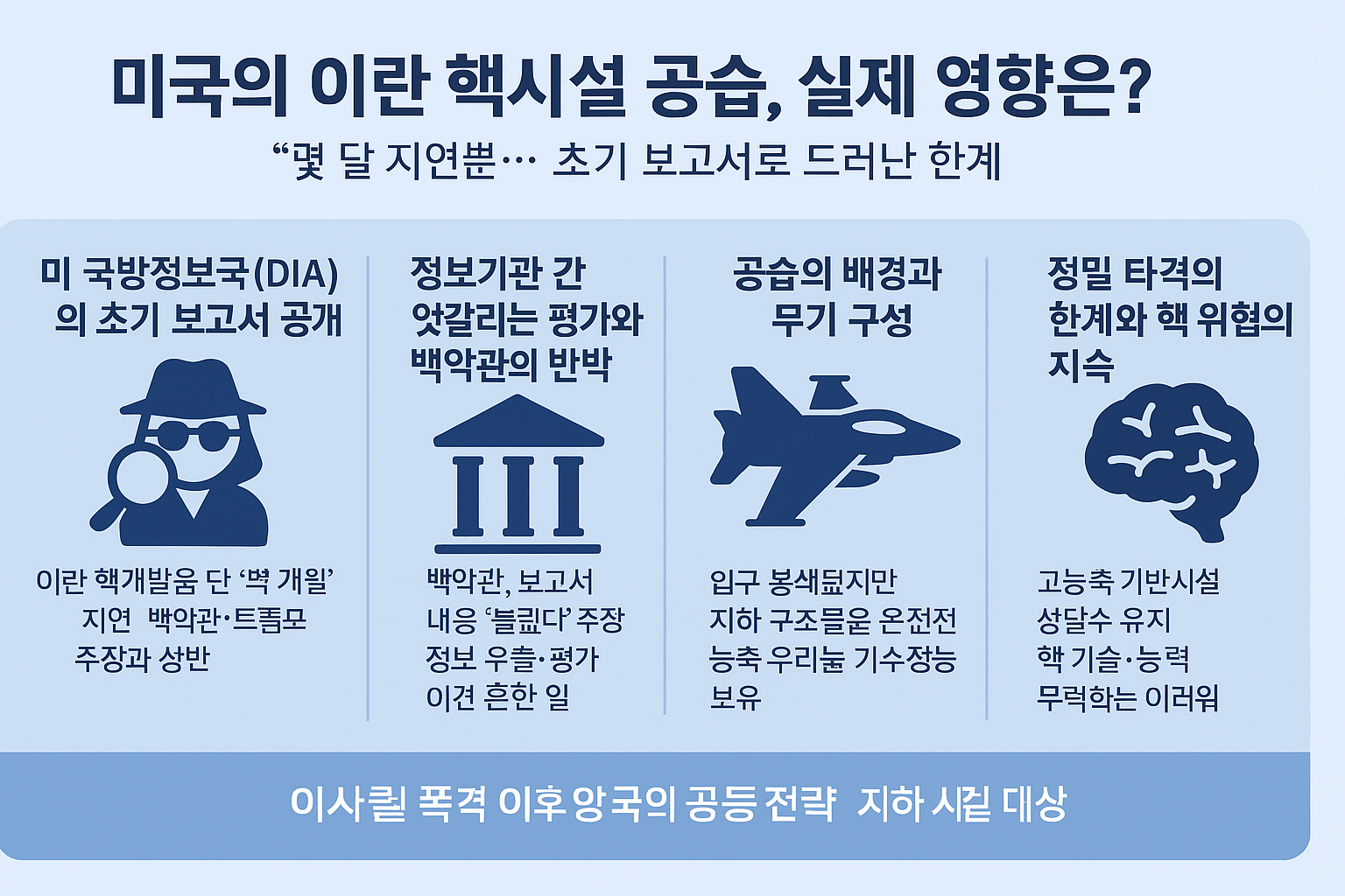 미국의 이란 핵시설 공습은 단기적으로 보았을 때 일정 수준의 물리적 타격을 가한 것은 사실입니다. 하지만 DIA 보고서가 드러낸 현실은, 정밀한 군사작전으로도 ‘핵 위협’이라는 구조적 문제를 완전히 제거할 수 없다는 점을 명확히 보여줍니다. 더욱이, 이번 공습은 이란의 핵무기 보유 의지를 꺾기는커녕 오히려 그 정당성을 강화하는 명분이 될 가능성도 배제할 수 없습니다.