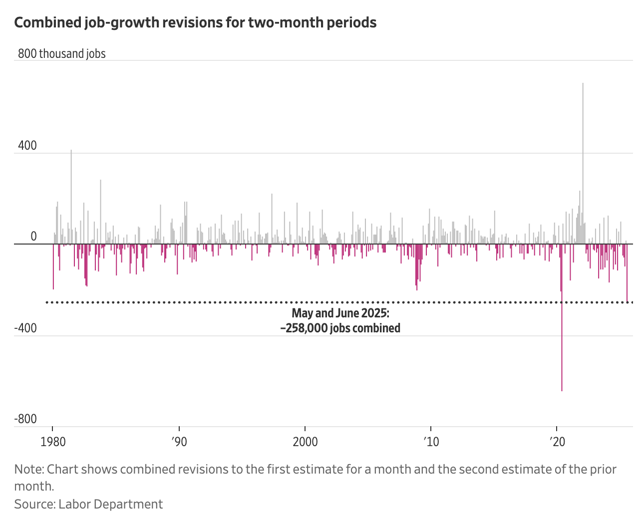 미국 경제의 둔화가 확실히 현실화된 순간은 바로 7월 고용 보고서 발표일, 금요일 아침이었습니다. 시장은 적어도 10만~15만 개 이상의 일자리 증가를 기대했지만, 실제로 발표된 수치는 단 73,000개에 불과했습니다. 이는 시장 컨센서스를 한참 밑도는 수치일 뿐 아니라, 그보다 더 충격적인 사실은 이전 두 달치 고용 수치가 대규모 하향 조정되었다는 점입니다.