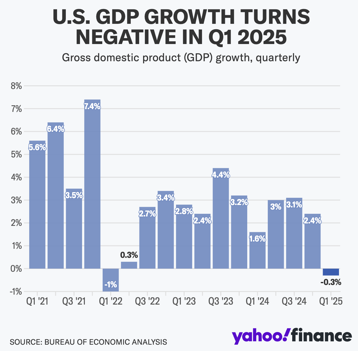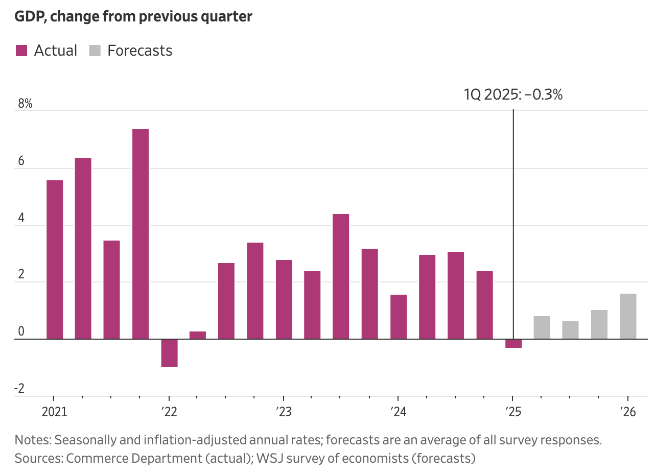 2025년 미국 경제는 예상과 달리 1분기에 연율 기준 -0.3% 역성장을 기록했습니다. 이는 월스트리트저널이 예상한 +0.4% 성장률보다 낮았으며, 2022년 이후 가장 큰 분기 감소폭입니다.