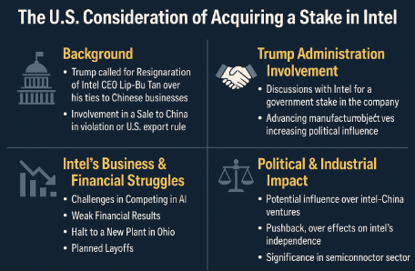 트럼프 행정부가 미국 반도체 산업의 부흥을 위해 인텔(Intel)에 대한 정부 지분 인수 가능성을 논의하고 있습니다. 이는 미국의 제조업 자립을 강화하고, 중국과의 기술 패권 경쟁에서 우위를 확보하려는 전략의 일환으로 보입니다. 동시에, 인텔 CEO 립 부 탄(Lip-Bu Tan)에 대한 트럼프 대통령의 공개적인 사임 압박 이후 벌어지는 정치·경제적 드라마이기도 합니다.