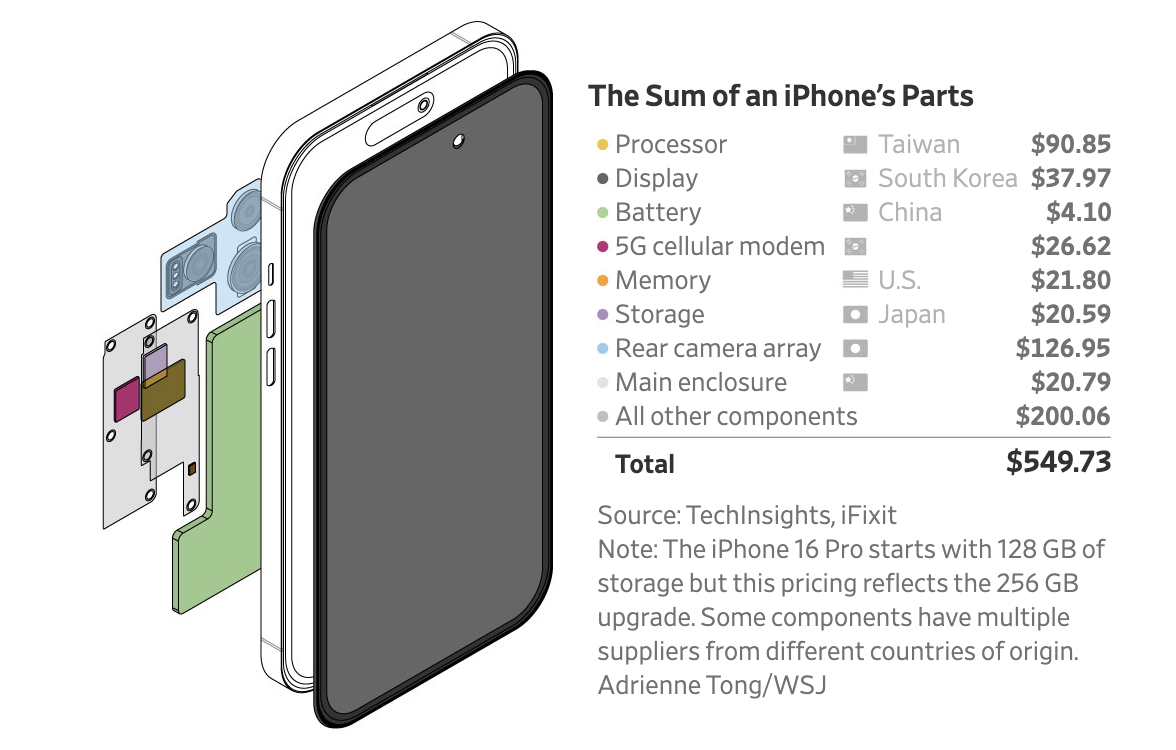 아이폰에는 무려 40개국 이상에서 만들어진 부품이 들어간다. 핵심 부품은 대부분 중국·대만·일본·한국 등 아시아 인근에서 조달된다.
