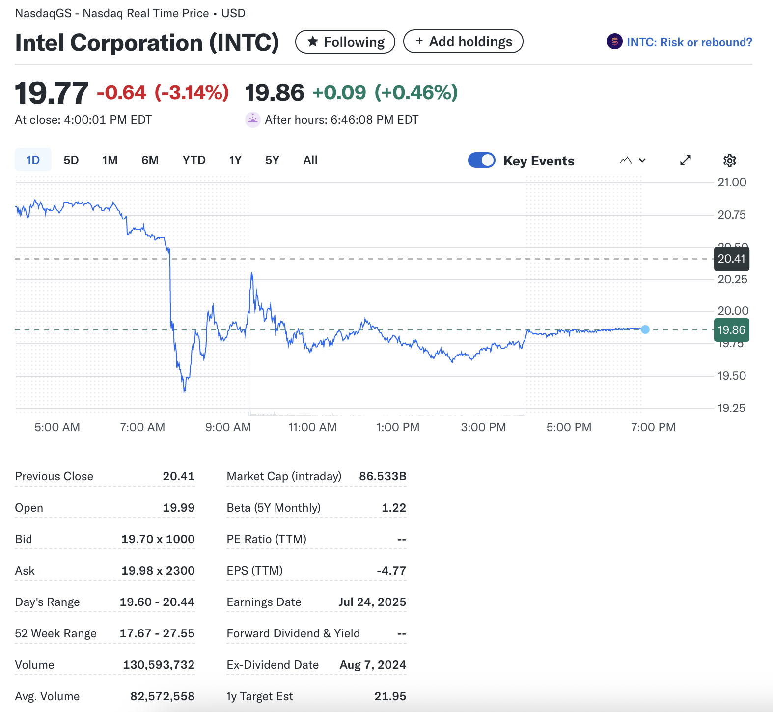 그 결과 인텔의 주가는 2024년 초 대비 약 60% 가까이 폭락한 상태입니다. 이는 단순한 주식 시장의 조정이 아니라, 투자자들의 신뢰가 근본적으로 흔들리고 있다는 신호로 해석됩니다. 실제로 시장은 인텔의 장기적 성장 가능성보다는, 단기적인 생존력과 정치적 리스크에 더 민감하게 반응하고 있습니다.