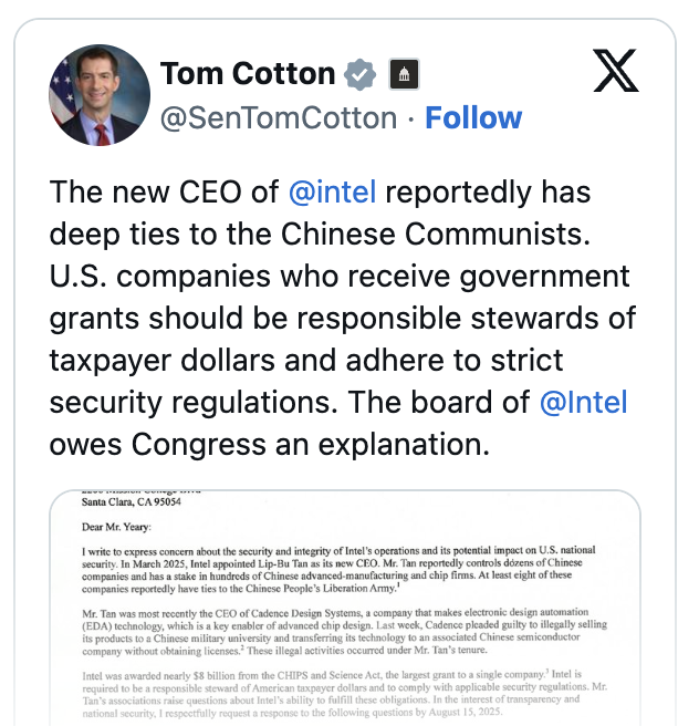 하지만 취임한 지 5개월도 채 지나지 않은 시점, 그는 미국 정계로부터 거센 정치적 압박에 휘말리며 사면초가에 몰리고 있습니다. 공화당 상원 중진 톰 코튼(Tom Cotton)은 탄 CEO가 과거 벤처 투자자로서 중국 기술 스타트업과 국방 관련 기관에 관여했다는 점을 들어 인텔 이사회에 공식적으로 사퇴를 요구했습니다. 이 같은 의혹은 인텔의 CEO 자리에 대한 ‘신뢰성 문제’를 공공 영역으로 끌어올린 첫 사례가 되었습니다.