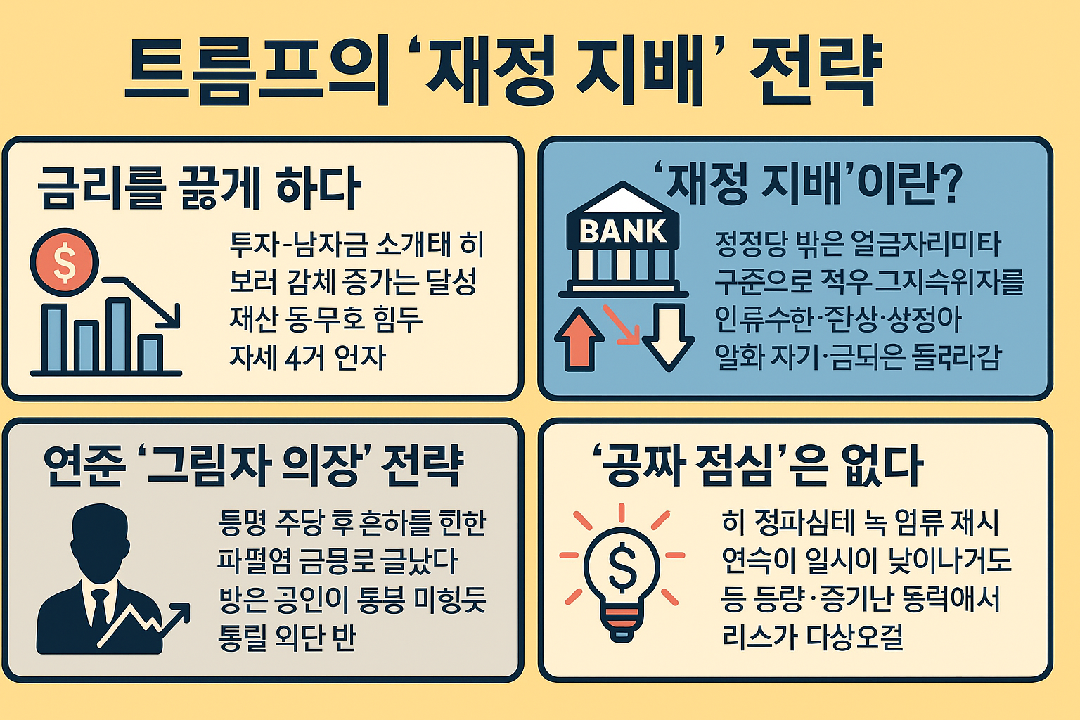 미국 경제의 심장부에서 조용하지만 거대한 충돌이 벌어지고 있습니다. 전통적으로는 독립적인 중앙은행이 통화정책을 주도하고, 정부는 별도로 재정정책을 설계하는 것이 당연한 원칙이었습니다. 하지만 도널드 트럼프 전 대통령은 이 오랜 균형을 흔들고 있습니다. 그는 “저금리는 성장의 핵심”이라 믿으며, 금리 인하를 통해 막대한 감세 정책을 지속 가능하게 만들려는 ‘이중 전략’을 펼치고 있습니다.