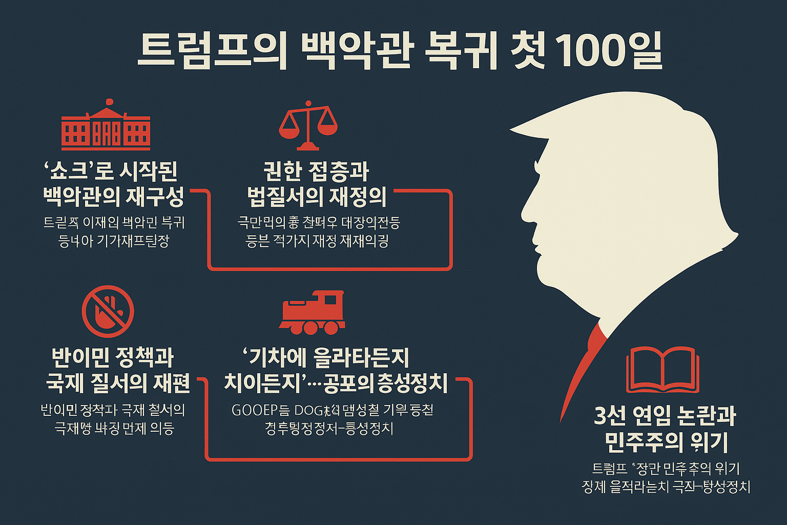 도널드 트럼프의 두 번째 임기 첫 100일은, 단순한 정치적 복귀가 아닌 헌정 질서 자체에 대한 구조적 개편의 서막이었습니다. 그는 권력을 단순히 행사하는 것이 아니라, 권력의 구조와 운영 방식 자체를 자신 중심으로 재설계하려는 시도를 펼쳤습니다. 그의 정책은 빠르고, 급진적이며, 무엇보다도 충성이라는 감정적 동기에 의해 움직였습니다.