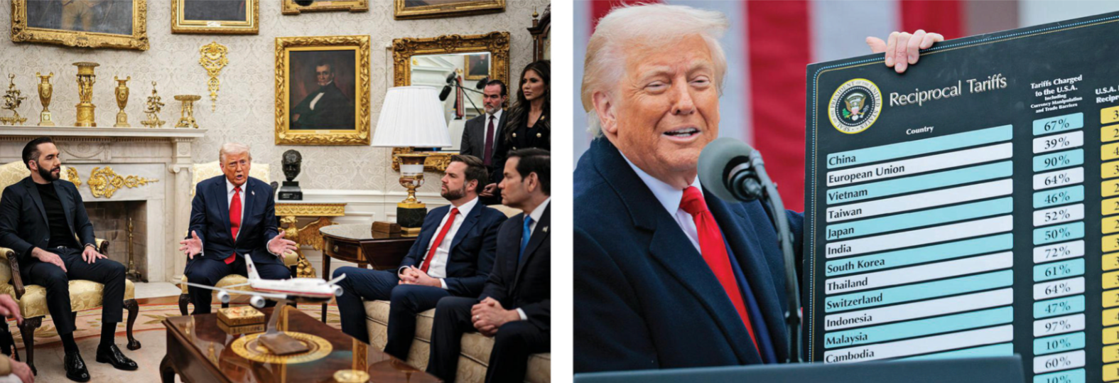 트럼프는 2025년 첫 100일 동안 이민자들을 대거 추방하고, 엘살바도르에 있는 악명 높은 감옥으로 송환하겠다고 위협했습니다. 그는 중국과 무역 전쟁을 본격화하고, NATO의 역할을 재조정하며 국제 질서에 대한 미국 우선주의 노선을 강화했습니다. 또한 멕시코, 파키스탄, 말레이시아 등과 맺은 조약을 재검토하며 경제와 외교를 하나로 결합시키는 전략을 펼쳤습니다.