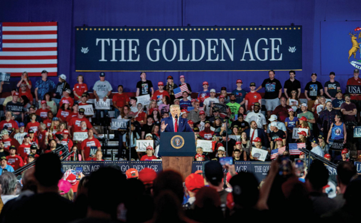 트럼프는 자신이 열어가고 있는 미국의 시대를 ‘The Golden Age’(황금시대)라 부릅니다. 실제로 그는 2025년 4월 29일 미시간주 워런에서 열린 대규모 집회에서 이 문구가 크게 적힌 연단에 올라 지지자들과 함께 세 번째 ‘시대 선언’을 발표했습니다. 그러나 그 실체는 과연 진정한 황금시대일까요? 아니면 **자유와 권리의 뒤편에 드리운 ‘제국의 그림자’**일까요?