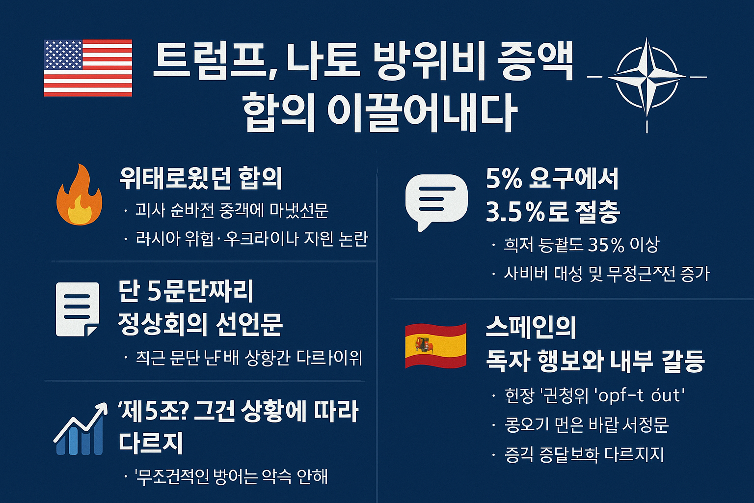 이번 나토 방위비 증액 합의는 단순한 ‘예산 협의’가 아니라, 트럼프 대통령과 유럽 주요국 간의 정치적 줄다리기였습니다. 그 중심에서 막판까지 합의문 발표를 가로막은 나라는 다름 아닌 스페인이었습니다.