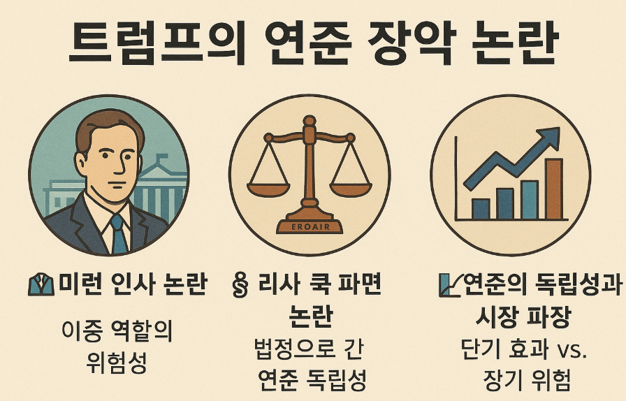 - 현재 상황: 트럼프 대통령이 미런 임명, 쿡 해임을 동시에 추진하는 것은 사실상 연준의 의사결정 테이블을 정치화하려는 시도로 해석됩니다.