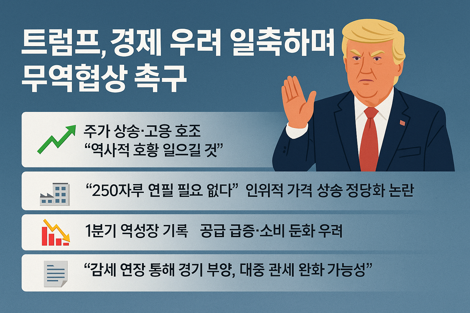 트럼프 대통령과 측근들은 최근 증시 상승세와 예상보다 나은 고용지표를 근거로 "경제 회복세가 보인다"며 자신감을 보이고 있습니다. 그는 NBC 인터뷰에서 “경기 침체도 가능성은 있다”고 언급하면서도, “내 정책이 역사적인 호황을 일으킬 것”이라고 강조했습니다.