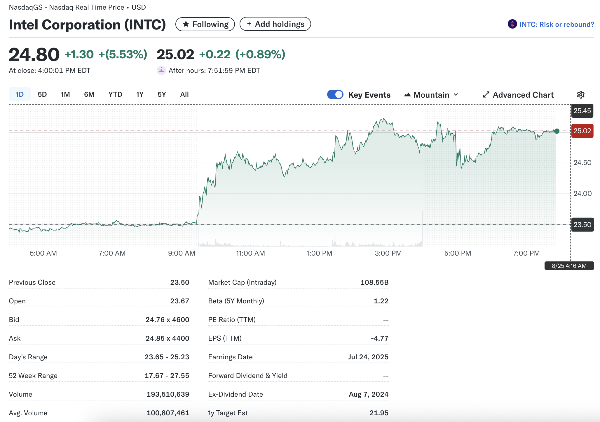 인텔 지분 거래 소식이 발표되자, 금융시장은 즉각적으로 긍정적인 반응을 보였습니다. 발표 당일 인텔 주가는 5.5% 상승하며 단기적으로 투자자들의 기대감을 반영했습니다. 최근 몇 달간 인텔은 잇따른 실적 부진과 리더십 불확실성으로 주가가 반 토막 난 상태였는데, 이번 소식이 **‘구원투수 효과’**를 발휘한 것입니다.